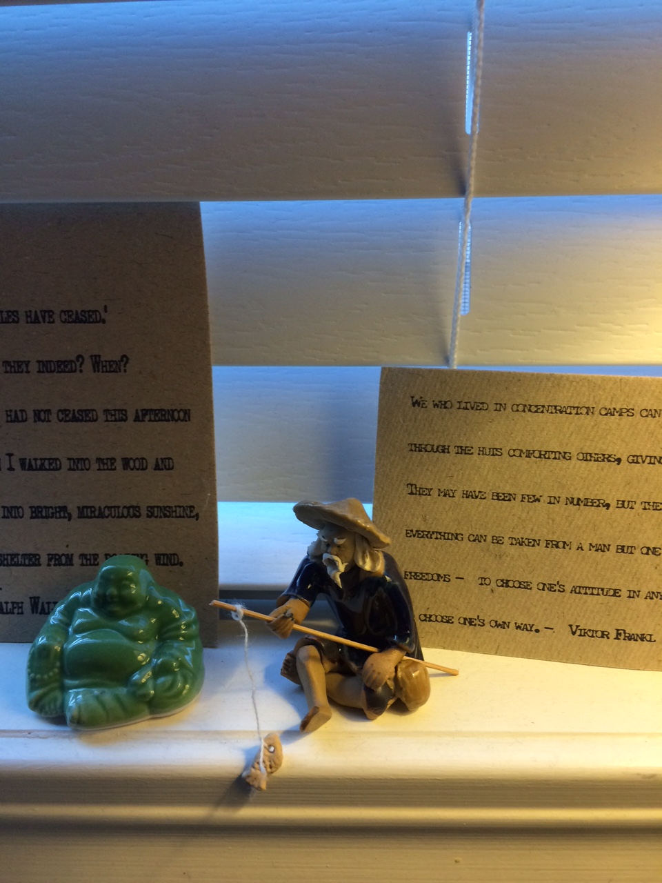 Buddha guards some work of Ralph Waldo Emerson, just as a fisherman patiently watches over Viktor Frankl.