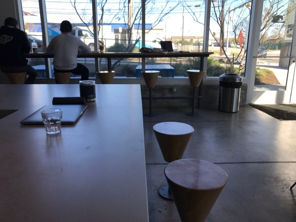 This coffee shop, Bob Dylan’s voice raining down from an overhead speaker, could be anywhere.
