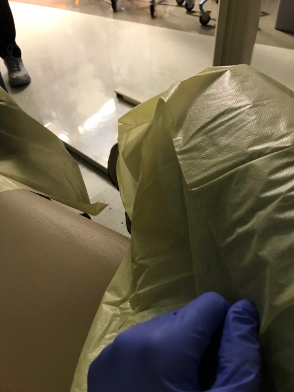 The rustle of paper gowns, going on and coming off. Purple gloves occasionally dropped on the floor, white-and-yellow face masks allowing eyes to shine, to water.